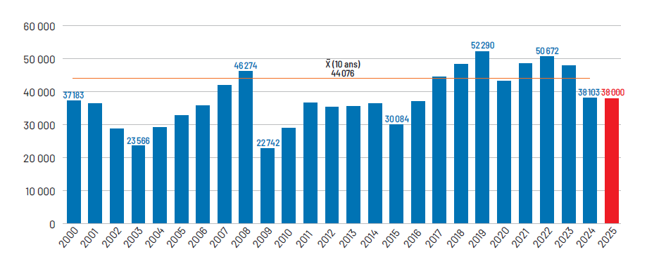 Pour cette année, le Seimat s’attend à un résultat équivalent, soit 38 000 unités vendues, dont 3 900 matériels lourds, ce qui représenterait une légère hausse par rapport à 2024, de l’ordre de 1 à 2 %. « C’est la vision de nos adhérents, qu’on estime être fine par rapport à leurs carnets de commandes, souligne Pascal Petit-Jean, secrétaire général du Seimat. A la veille d’un nouveau cycle électoral, on aurait dû être mieux placés ». En observant les données du Seimat sur les 25 dernières années (figure 3), on remarque des cycles de 6 à 7 années, lors desquels les ventes baissent puis finissent par remonter.