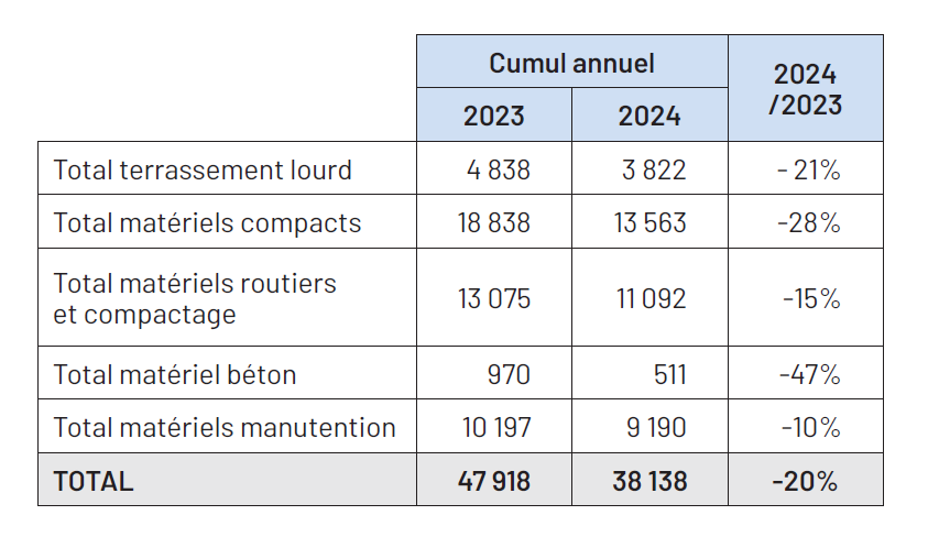 En 2024, tous secteurs confondus (matériels de terrassement, de levage et manutention, pour le béton, de compactage et routier), 38 138 unités ont été vendues en France, soit une baisse de 20 % par rapport à l’année précédente (figure 1).